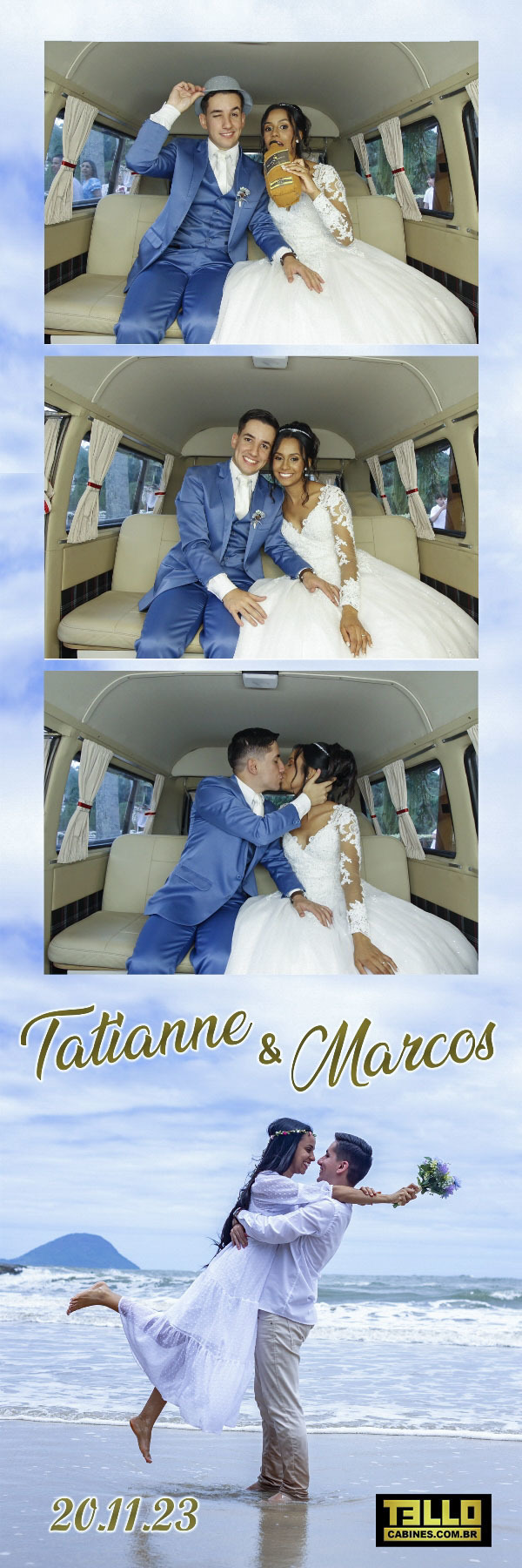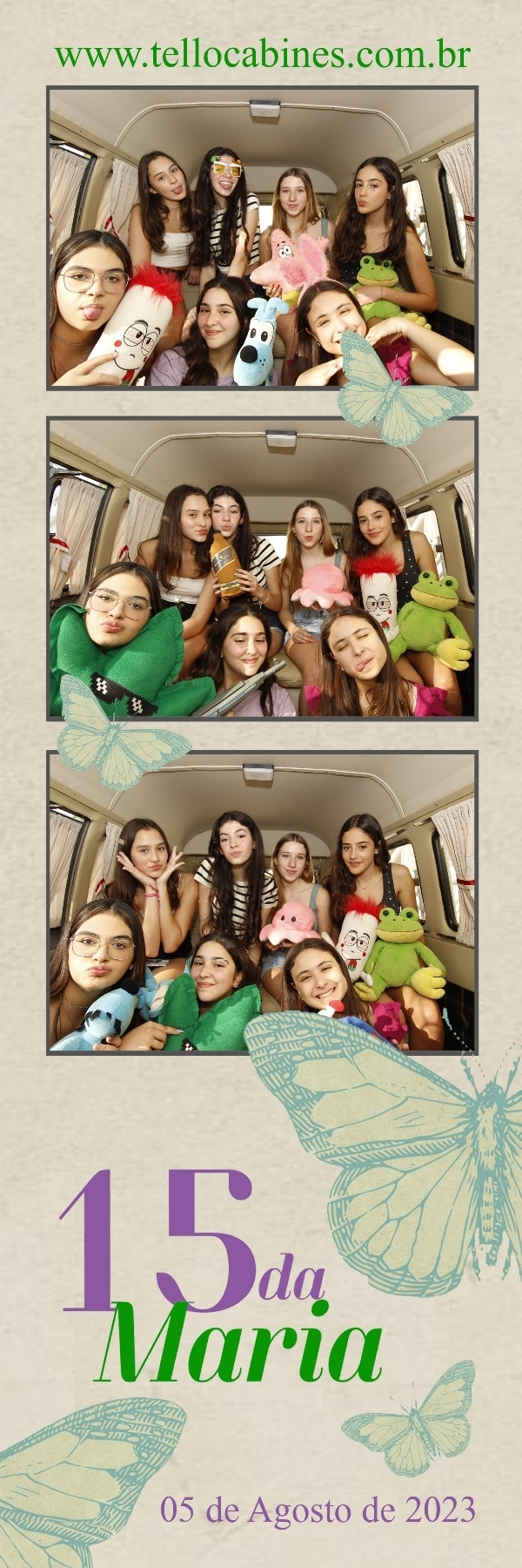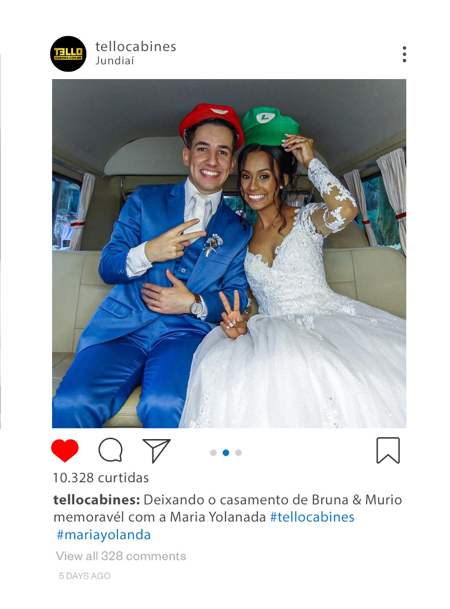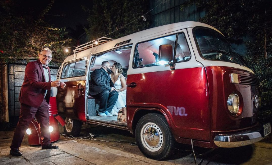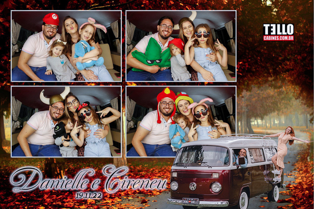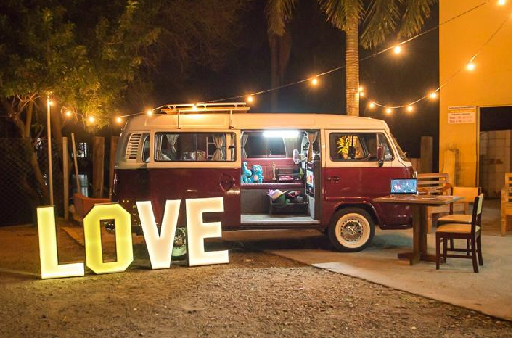 Você pode contratar ela como cabine de fotos, totem fotográfico com a kombi de fundo ou ela apenas como cenário.