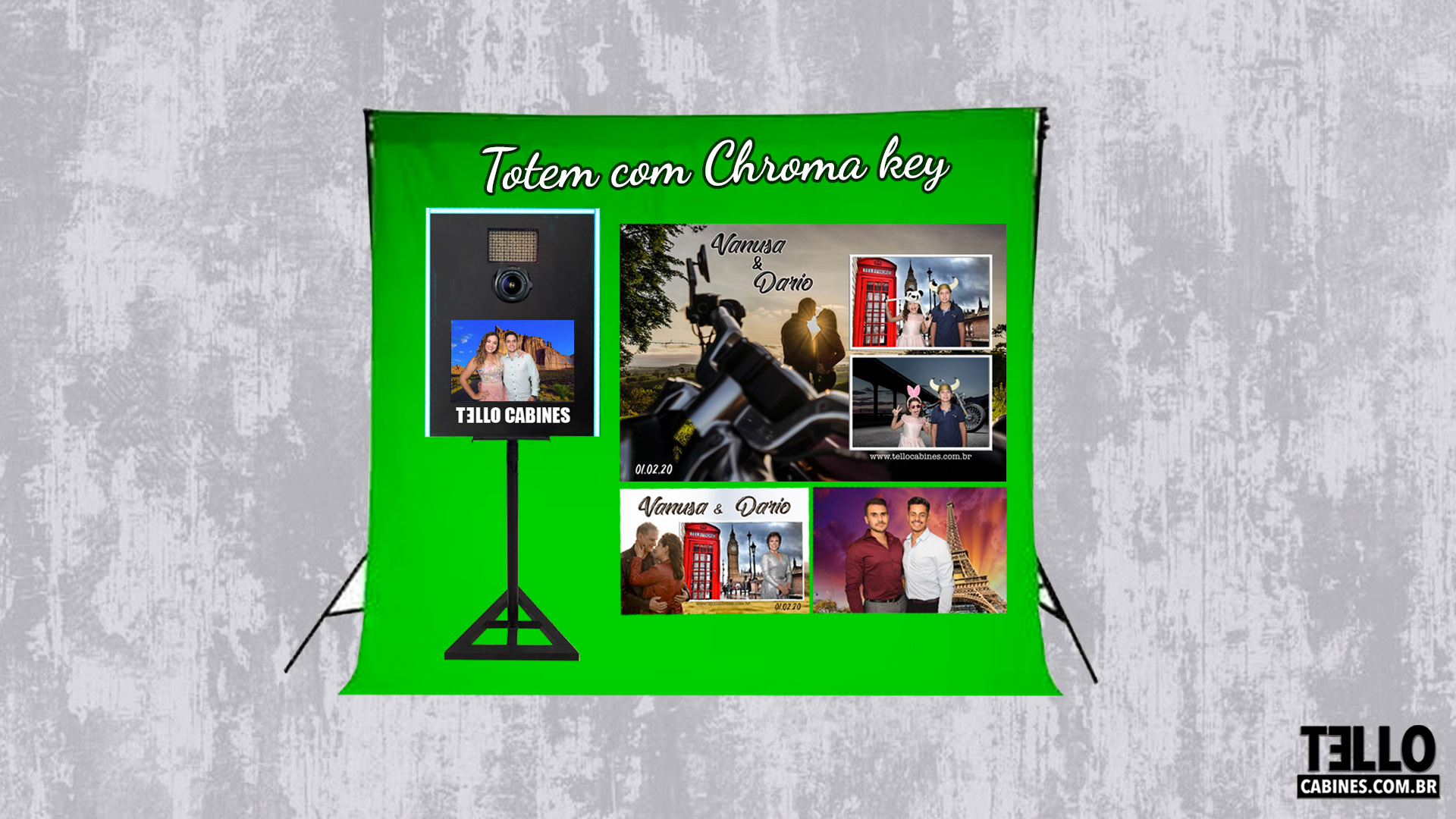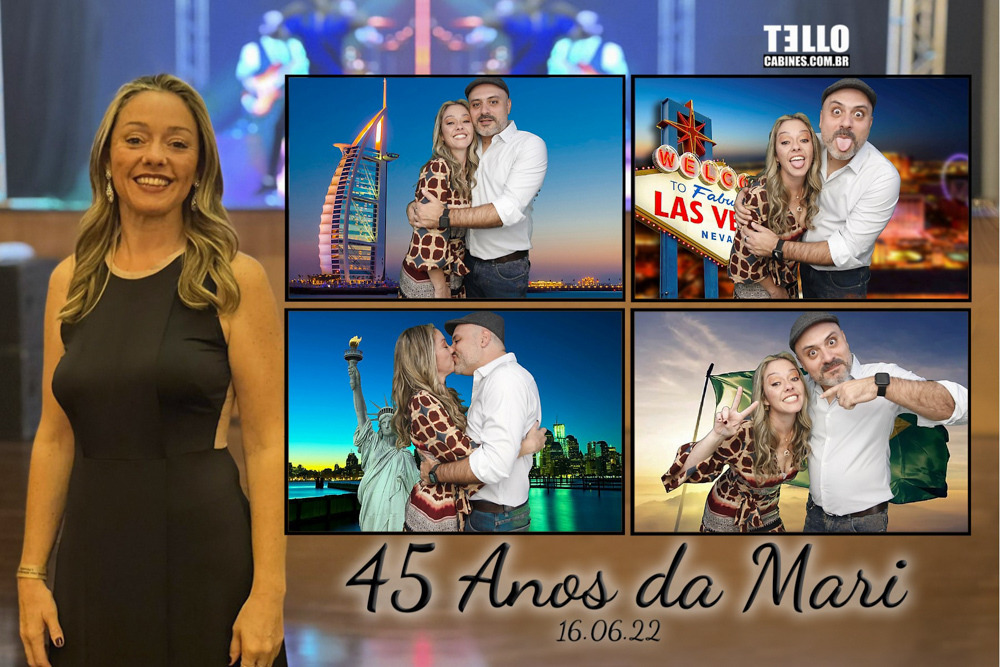 Ideal para pequenos eventos onde não se tem muito espaço, Sistema onde o convidado escolhe o layout e depois o fundo de cada foto. Podemos usar imagens suas ou do banco de imagens que temos.